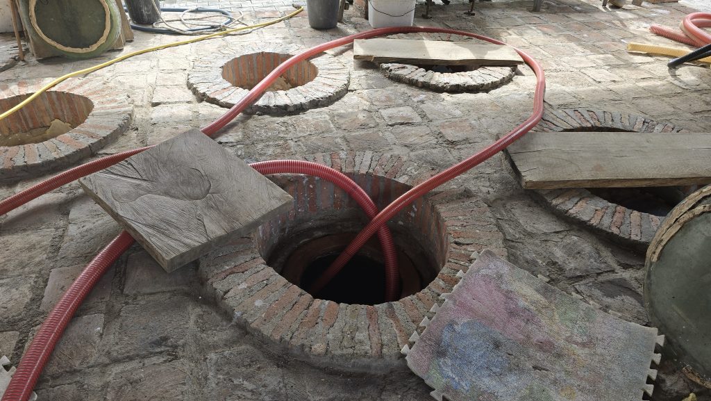 Der Helfer reinigt die im Boden eingelassenen Tongefäße