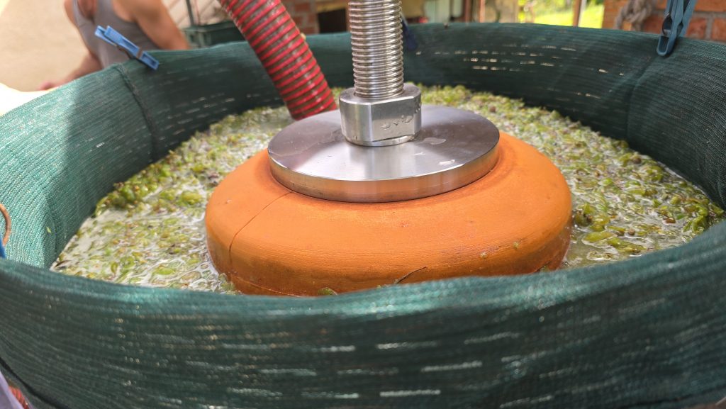 Der Rest vom Fest kommt auf den Kompost. Vorher werden über Druck die Trauben bis zum letzten Ende ausgepresst.