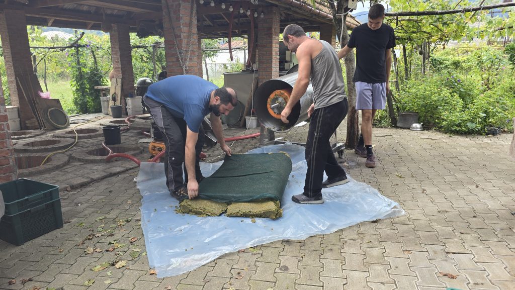 Dann starten wir zum Besuch in dem Weingut, dass wir Google gefunden und für gut befunden hatten. Nach einiger Fahrt kommen wir an. Die Damen des Hauses kochen in ihrer für uns romantischen, für sie alltäglichen Sommerküche in einem Holzhaus. Ein großer Topf auf einer kleinen, feuerbeheizten Stelle breitet köstliche Aromen aus. Fleisch , Obst, Gemüse schnippeln die Frauen und später noch ein Mann, der mit dem Einkauf dazu kommt. Wie wir später erfahren, werkeln alle, um abends 50 Personen glücklich zu machen. Der Chef des Hauses tritt aus dem Haupthaus etwas verschlafen und etwas später. Wir bekamen schon richtig guten Kaffee in Espressotässchen. Der Chef des Hauses mag mit uns nicht viel anfangen und telefoniert. Am Telefon sprechen wir mit einem deutsch sprechenden Menschen und er käme, um uns zu übersetzen.Wie nett.Wir warten geduldig. Misha kommt irgendwann und ab da dürfen wir teilhaben. Ein Helfer, Mishka als freiwlliger Helfer und der Chef schütten die gestern geernteten Trauben aus den dutzenden Kisten in den Traubenrapper, der die Früchte vom Strunk trennt. Dann zieht ein Schlauch über Druck die Trauben in ein sehr großes Entsaftunggsgerät. Es erinnert mich an mein kleines zu Hauses. Druck presst den Traubensaft aus dem Sieb in die Auffangschale der Presse und fließt über Schläuche in die in Erde eingelassenen tönernden Amphoren. Heute pressen die Männer Weißwein von hellen Trauben. Die Maische der roten Trauben gärt in anderen Amphoren. Der Helfer rührt die Maische um. In den Pausen, in denen die gepressten Trauben zusammen sacken, trinken wir mit dem Chef und Misha den leichten Weißwein. Der Chef fragt, ob wir für ein Lokal in Tiblissi Wein mitnehmen könnten. Klar, gern. Also beladen wir nach Besichtigung des Kellers unseren Freund Duster mit paar Kisten Wein. Von Mishka erfahren wir viel über Georgien, seine Politik, seine Landsleute , über den georgischen Wein und etwas von seiner Biographie als Wolgadeutscher. Vielleicht treffen wir uns wieder, in Tiblissi, oder später in Deutschland.