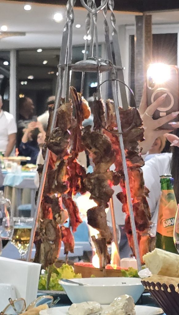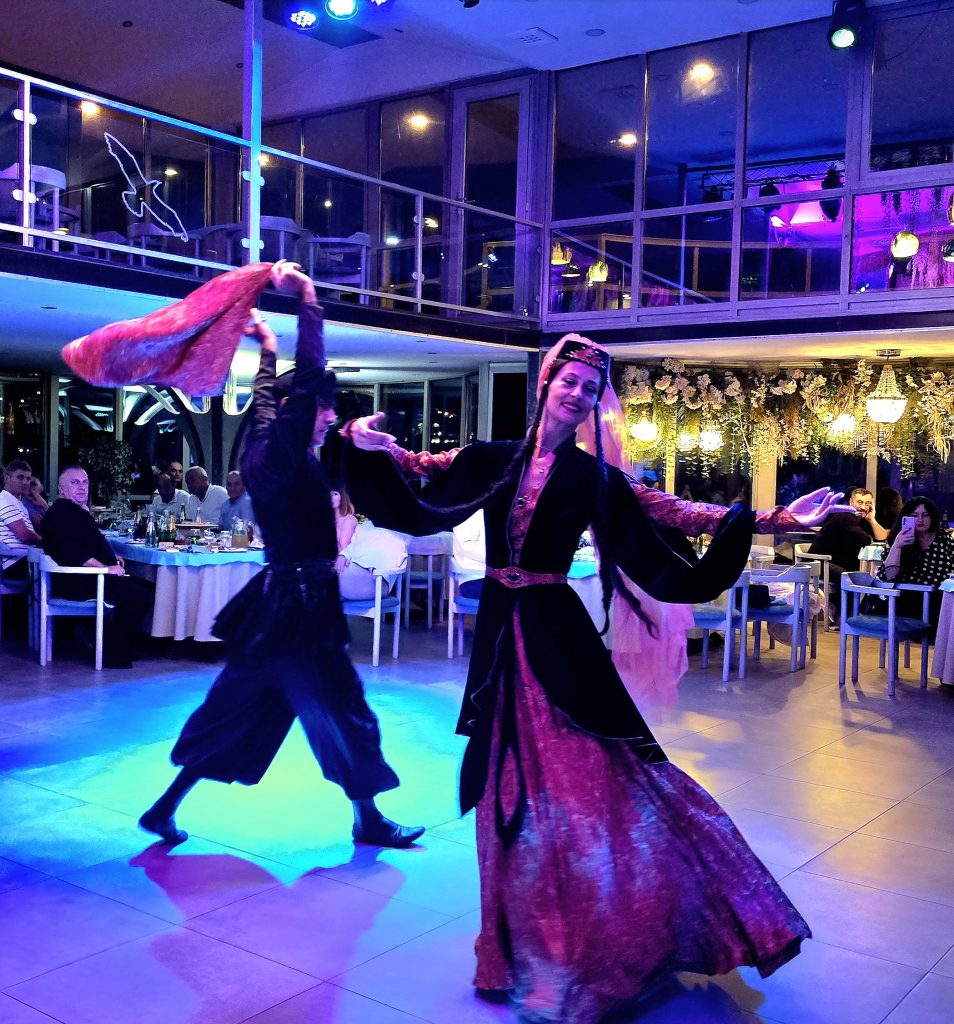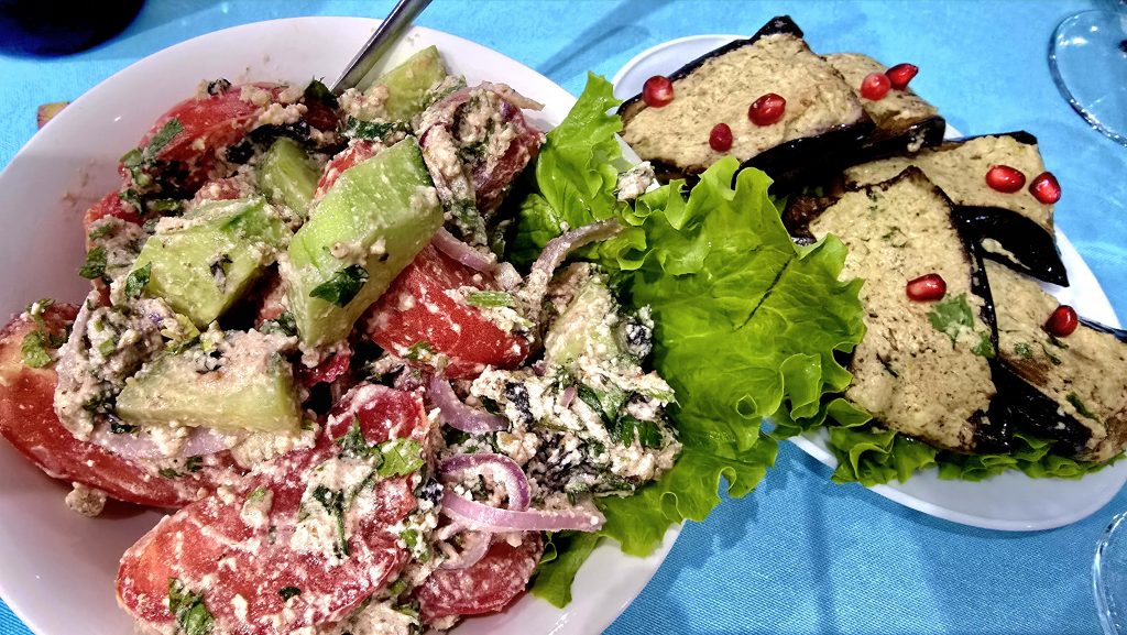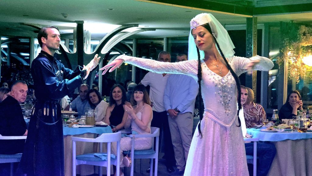 Hier nebenan in Tbilisi geben wir den Wein ab und suchen uns ein Hotel. Nach einer abenteuerlichen Fahrt steil bergauf und bergab und wieder bergauf landen wir in einem Hotel. Leider bietet uns der Rezeptionist ein Zimmer im Keller an, obwohl wir was mit Gartenblick gebucht hatten. Ich rege mich auf und,Reiner sagt ihm, das ist nicht gut für das Herz und so fahren wir hoch in den 3.Stock, wo der Herr mit uns diskutiert, das wäre größer und teurer. Da es sich aber um umgerechnet eine Verzeuerung von 2 € handelt geben wir ihn das Geld. Ich reichte ihm aus Versehen meinen Pass mit dem € Bargeld rüber, was ich zur Sicherheit mitführe. Da kriegte er vielleicht ydollarzeichen in die Augen. Nach dem Duschen laufen wir den ganzen Berg runter und gehen in das erstbeste Restaurant auf dem Weg. Auch das erweist sich als Glücksfall. Sicher mehr als hundert oft festlich gekleidete Gäste dinnieren an großen Tafeln. Eine Band spielt auf, ein Zauberer kommt, und wir erleben feinen georgischen Tanz. Aber vor allem das Essen ist vorzüglich.es gibt die gebratenen Auberginen mit Walnusspaste und Granatapfelkernem, die ich von Aserbaidschan in bester Erinnerung habe. Auch der Guken Tomaten Salat mit Walnusspaste, Blattkoriander und Knobi ist ein Genuß. Die Oberkellnerin ist sehr nett zu allen Gästen, aber besonders nett zu uns, siehat Verwandtschaft in Deutschland und spricht etwas deutsch.